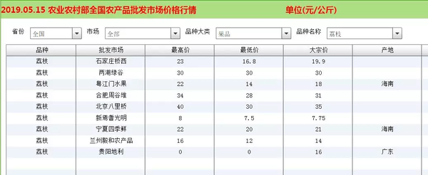 而从近一年的数据来看,荔枝价格的高点在2019年2月28日的北京八里桥市场,报价65元每公斤。而最低点则是2019年5月15日贵阳地利市场的报价,仅为3元每公斤。