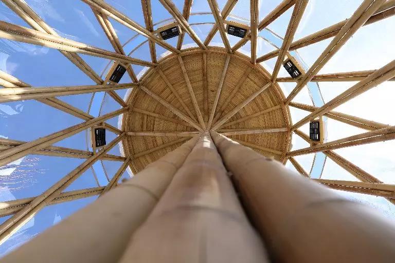 在观看演出前,与会嘉宾参观游览了国际竹藤组织园。以“竹之眼”展馆为主体建筑的国际竹藤组织园,主体采用5000多根毛竹搭建而成,单拱跨度达到32米,是目前中国北方地区的跨度最大的圆竹结构场馆。园区建设和绿化选用了毛竹、斑竹、龟甲竹、金镶玉竹等15种竹子,作为全球1642个竹种的代表,向大家展示“人丁兴旺”的竹子大家庭。来自南方和北方的竹子相聚这里,或密或疏,高低相间,韵味十足,可谓本次北京世园会的一道靓丽风景。