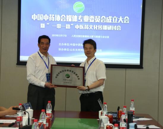 图为中国中药协会刘张林副会长(左)为媒体专业委员会授牌