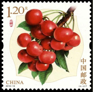 5月正是樱桃成熟期,人们相聚在樱桃树下,边采摘边品尝,感受着初夏的味道。2018年7月14日,我国邮政部门发行的“水果”邮票,其中可见樱桃的倩影。