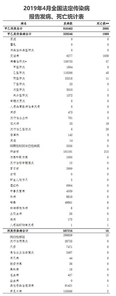 附:2019年4月全国法定传染病报告发病、死亡统计表