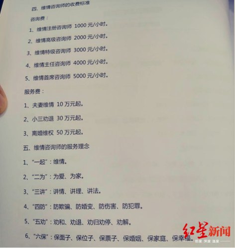 “打包”的服务费更高:夫妻维情10万元起;小三劝退30万元起;离婚维权50万元起。