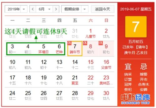 今年端午节放假时间为6月7日至9日三天,巧妙采用“拼假”--只要能在6月3日-6日请假4天,端午节便可连休9天。