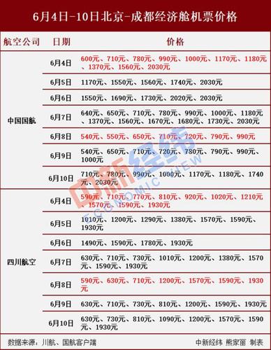 以北京至成都经济舱为例,6月4日-10日期间,中国国航的最高票价为6月6日的2030元(以下价格均不含税费及燃油费),最低票价为6月8日的540元,票价落差1490元。其中,6月4日的单程票价落差最大,为1430元;6月8日的票价落差最小,为450元。