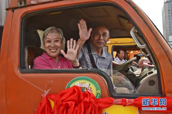 2013年8月31日,上海董家渡18号地块搬迁居民向欢送人群招手致意。当日,上?;破智叶?8号地块首批居民集体搬迁。新华社发(郭长耀 摄)