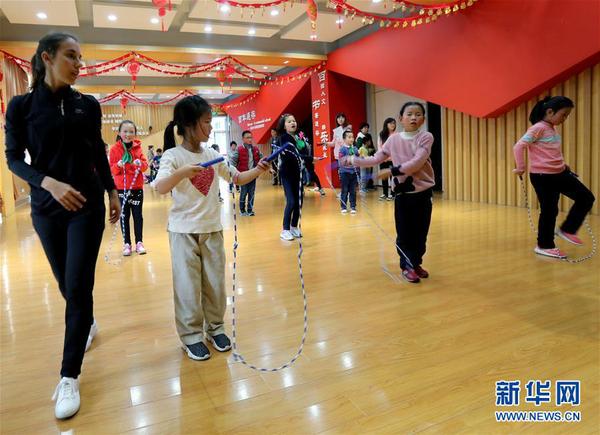 上海市适存小学学生放学后在老师的指导下练习花样跳绳(2019年3月20日摄)。当日起,上海全市小学将免费课后服务延时至下午6点。新华社记者刘颖摄