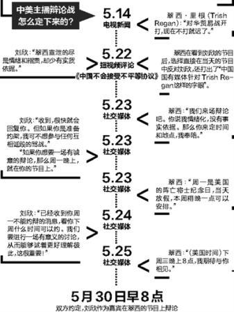 5月30日早8点,中国国际电视台(CGTN)女主播刘欣将应邀以嘉宾身份,与美国??怂股桃灯档溃‵ox Business)女主播翠西·里根(Trish Regan)进行卫星连线辩论。此前两人已经就经济话题“隔空互怼”了一轮,如今升级为在社交网络上约时间、约场子、面对面辩论。这将是史上首次中美两国女主播“约辩”。