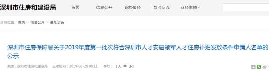 5月28日,深圳市住房和建设局网站公布了《深圳市住房保障署关于2019年度第一批次符合深圳市人才安居领军人才住房补贴发放条件申请人名单的公示》。
