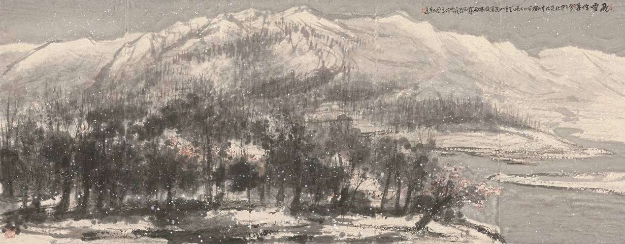 《飞雪伴春》实乃“大手笔、大气象、大境界”的煌煌巨作,笔苍墨润,逸韵天成。从形制上看,此画为横幅,高145cm,宽370cm(145X370cm),合计为48.3平尺,即行内惯称的“丈二匹”。此画在构图上运用了“平远法”(而非历代画家在表现“雪山”时所惯常采用的“高远法”与“深远法”),以树石组成近景,间以溪流,这不仅造成了以疏旷清寂为其特色的空间深度,也极易使观者对“自然”产生一种亲和感。当我们徐徐展开画卷,首先映入眼帘的便是银装素裹、岿然耸立的“大”山——这山,寓静于动(“飞雪”)又寓动于静,透发出一种横绝太古、遗世独立的超凡气度。