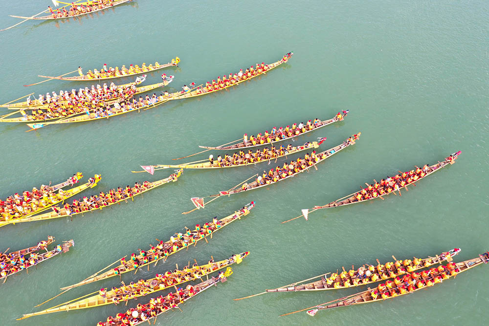 端午临近,湖南道县在潇水河上举行传统龙船赛,144艘龙船竞逐迎端午。道县端午划龙船历史悠久,“道州龙船赛”2006年被列入湖南省非物质文化遗产名录。 新华社发(何红福 摄)