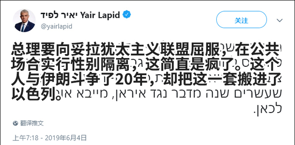 6月3日,以色列KAN广播电台报道称,该国宗教右翼政党“妥拉犹太主义联盟”(United Torah Judaism)暗示他们将会与利库德集团结盟,而这个联盟的条件之一是:通过一项允许在公共场合实行“性别隔离”的法案。