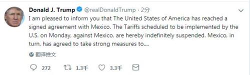 美国总统特朗普:与墨西哥达成协议 暂停关税措施