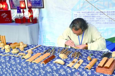 传承人在非遗影像展现场展示竹刻技艺。文化和旅游部民族民间文艺发展中心供图