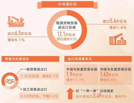 海关统计显示,前5月,我国货物贸易进出口总值12.1万亿元人民币,比去年同期增长4.1%。其中,出口6.5万亿元,增长6.1%;进口5.6万亿元,增长1.8%。各地区、各部门坚持以供给侧结构性改革为主线,深入落实中央稳外贸政策部署,加快推动外贸稳规模、提质量、转动力,外贸运行总体平稳、稳中提质。