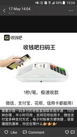 收钱吧员工在朋友圈发布的推广内容。