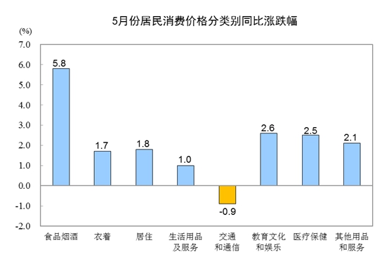 5月份,食品烟酒价格同比上涨5.8%,影响CPI(居民消费价格指数)上涨约1.69个百分点。其中,鲜果价格上涨26.7%,影响CPI上涨约0.48个百分点;鲜菜价格上涨13.3%,影响CPI上涨约0.31个百分点;畜肉类价格上涨12.5%,影响CPI上涨约0.51个百分点(猪肉价格上涨18.2%,影响CPI上涨约0.38个百分点);鸡蛋价格上涨8.7%,影响CPI上涨约0.04个百分点;禽肉类价格上涨6.4%,影响CPI上涨约0.08个百分点;粮食价格上涨0.5%,影响CPI上涨约0.01个百分点;水产品价格下降0.4%,影响CPI下降约0.01个百分点。