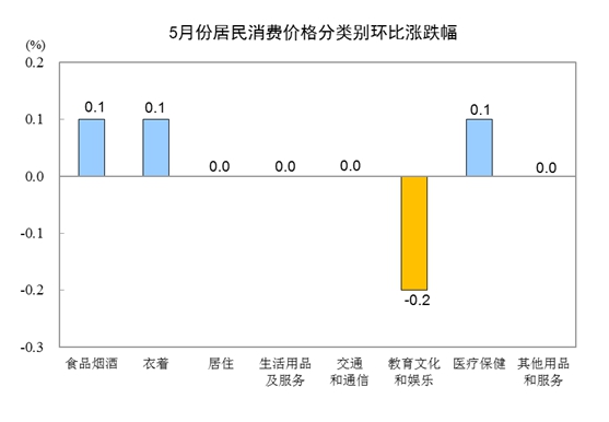 5月份,全国居民消费价格环比持平。其中,城市持平,农村上涨0.1%;食品价格上涨0.2%,非食品价格持平;消费品价格上涨0.1%,服务价格下降0.1%。