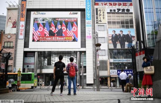 资料图:2018年6月,在日本东京的一个广场,人们通过户外大屏幕观看朝美领导人首次会晤的直播画面。