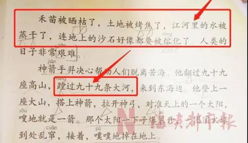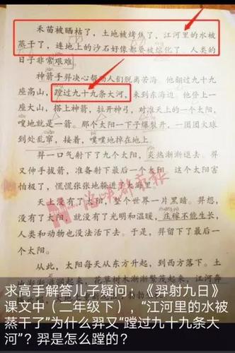 有一派家长很认真,他们一本正经地解释,这是夸张的写法,神话故事不要太讲逻辑,重在奇异;还有人说,大河的河床都比较深和宽,羿蹚过的可能是河床,课文少印了一个“床”字。但何女士不认可,她说,没有“蹚河床”的说法,对方也较真地说“也很少有人射日,更少人一次过九十九条大河”。