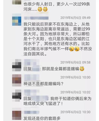 一位媒体工作者解释:大河可能因为海水倒灌而存,江河泛指小江小河,与大河不一样。网友“七个葫芦娃姥姥”也很认真地说,“我只能说后羿的家不在东海边上,从他家到东海边距离非常遥远,需要过九十九条大河,因为地球非常大,哪怕是十个太阳,也只是东海边区域的江河水干了,其他地方还有水。比如我们南北半球的气候不一样。”