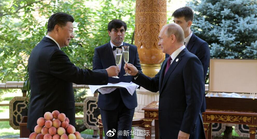 【俄罗斯总统普京当面向习近平主席祝贺生日】俄罗斯塔斯社、俄新社6月15日上午报道称,据俄总统新闻秘书佩斯科夫介绍,俄总统普京今天上午在杜尚别出席亚信第五次峰会前亲自前往中国国家主席习近平下榻宾馆,当面向习主席祝贺66岁生日。普京高度评价习主席在俄中关系发展中发挥的重要作用,强调不久前习主席对俄进行国事访问取得圆满成功,相信俄中关系将继续保持良好发展势头。习主席对普京表示感谢,指出普京在中国很受欢迎。普京总统向习主席赠送俄罗斯冰淇淋,习主席回赠中国茶叶。