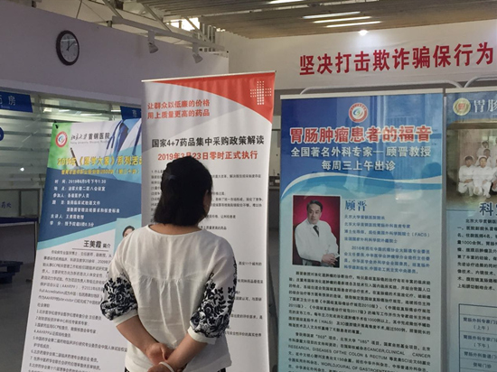 北京大学首钢医院门诊部大厅内的“4+7”政策宣传展板 / 邓睿 摄