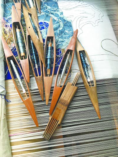 缂丝以生蚕丝为经线,彩色熟丝为纬线,织造时,先在织机上安装好经线,经线下衬画稿或书稿。