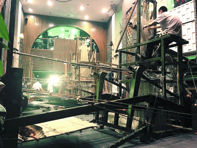 用蜀锦大花楼木质机织造蜀锦,拽花工须掌握多种技能。图为拽花工工作现场。