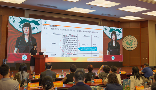 图为中国老年医学学会副会长兼营养与食品安全分会会长胡雯解读《适老营养配方食品通则》团体标准