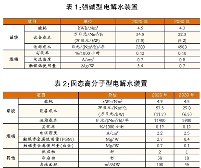 可再生能源制氢:为防止弃风弃光和限电,大规模利用可再生能源富余电力制氢,即电转气(P2G)技术已为市场普遍看好。日本已在福岛建立了全球最大的单机10MW级的电解水装备示范项目,最大年产量为900t,所制氢气将用于2020年东京奥运村的供电和供热。但要真正全面推广P2G项目,降低成本和减少转化损耗是关键。到2030年,电解水装置成本要从20万日元/kW降至5万日元/kW,能耗从5kWh/Nm3减少至4.3kWh/Nm3。强碱型和固体高分子型(PEM)电解水装备各项指标计划见表1、2。