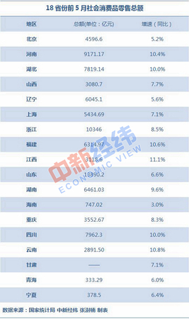 关键词:前5月18省份消费增速比拼