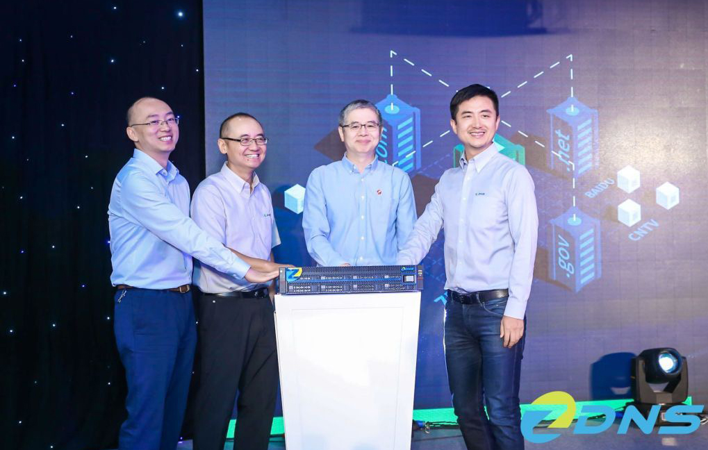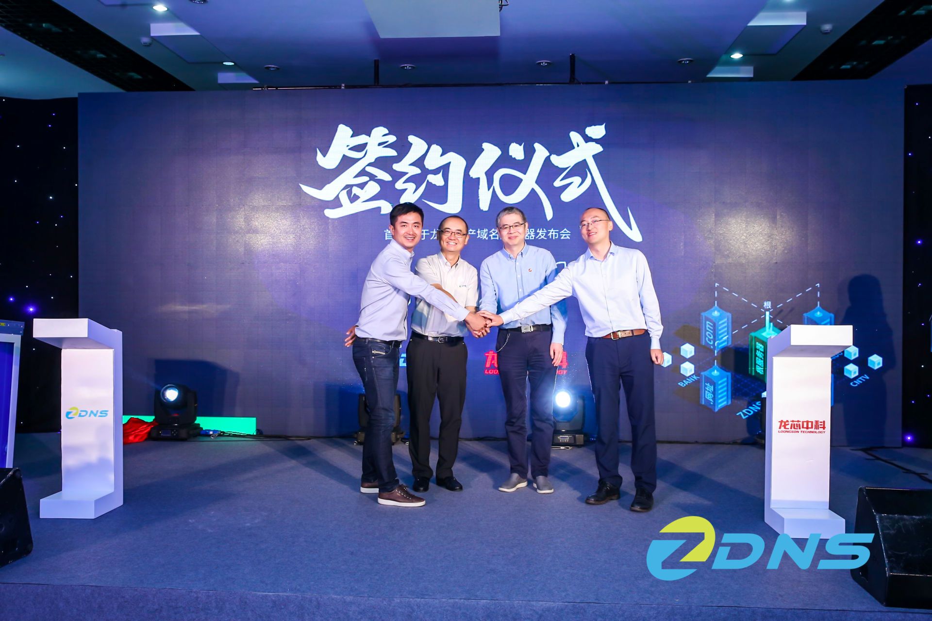 图为龙芯中科总裁胡伟武(右二)、域名国家工程研究中心主任毛伟(左二)、总经理邢志杰(左一)共同发布首款基于龙芯芯片的国产域名服务器