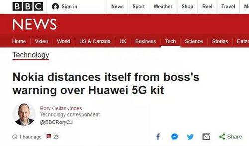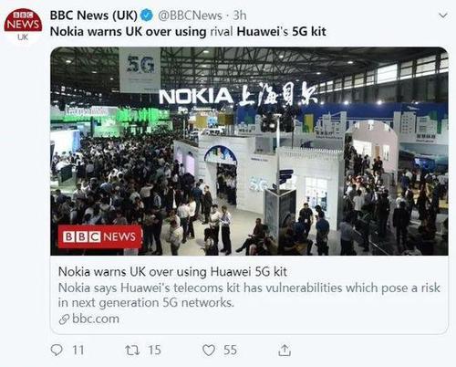 昨天上午,英国BBC先是发布了一篇名为“诺基亚警告英国不要用华为5G设备”的报道,称诺基亚公司的首席技术官(CTO)马库斯?韦尔登(Marcus Weldon)表示华为公司的5G设备并不安全,存在安全漏洞,会给5G网络带来风险。