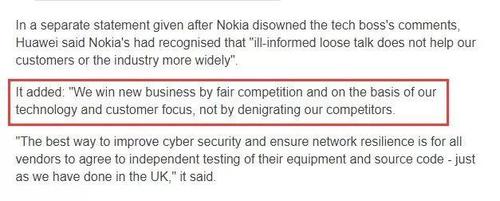 而在诺基亚方面澄清了其高管的言论后,华为则在一份最新的回应中表示:我们应该通过公平的竞争,通过我们对于技术和客户的关注来赢得业务,而不是靠诋毁竞争对手。