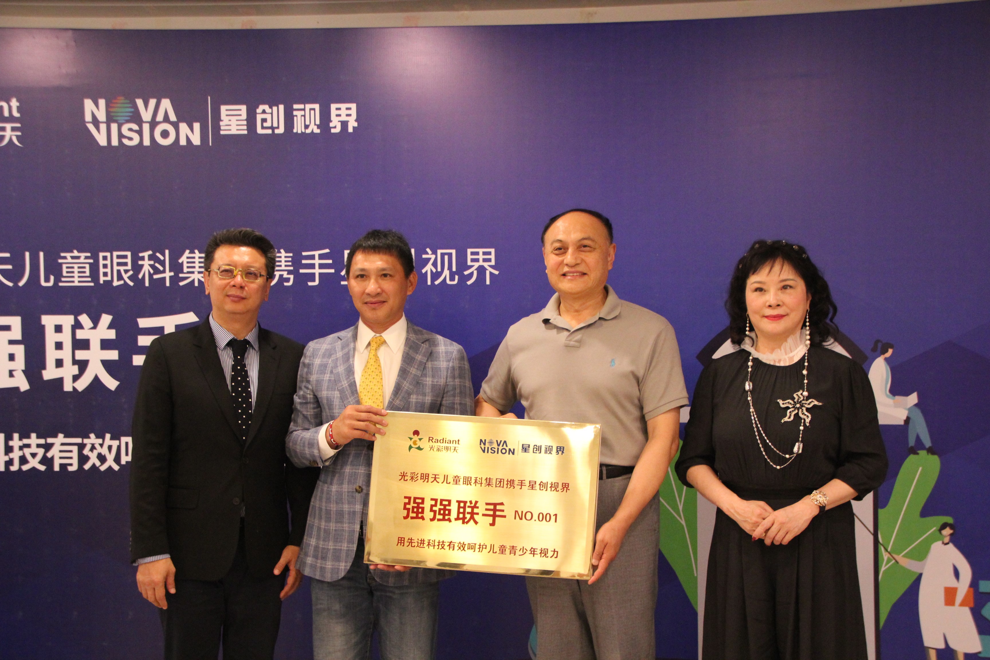 光彩明天与星创视界(宝岛眼镜母集团)强强联手,在京签署战略合作协议,用先进科技有效呵护儿童青少年视力。右一为港区全国政协委员冯丹藜,左一为星创视界创始人兼执行长王智民,右二为光彩明天儿童眼科医院院长李志升,左二为光彩明天儿童眼科医疗集团副总裁林明星。