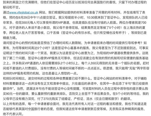 陈女士也在签证中心“憋了一肚子气”,在办理英国签证时,陈女士在网站预约了11点办理,提前到达后发现签证中心等待的人非常多,无法按照预约时间办理。工作人员向陈女士推荐了价值250元的VIP服务,这样就可以免排队。陈女士没有买,结果等待时间长达5小时。陈女士说:“VIP服务无可厚非,但是签证中心的预约机制和对办理时间的预估并不合理,预约了时间还是要排几个小时的队,感觉是故意让人排长队,不想排队就得买VIP服务。”