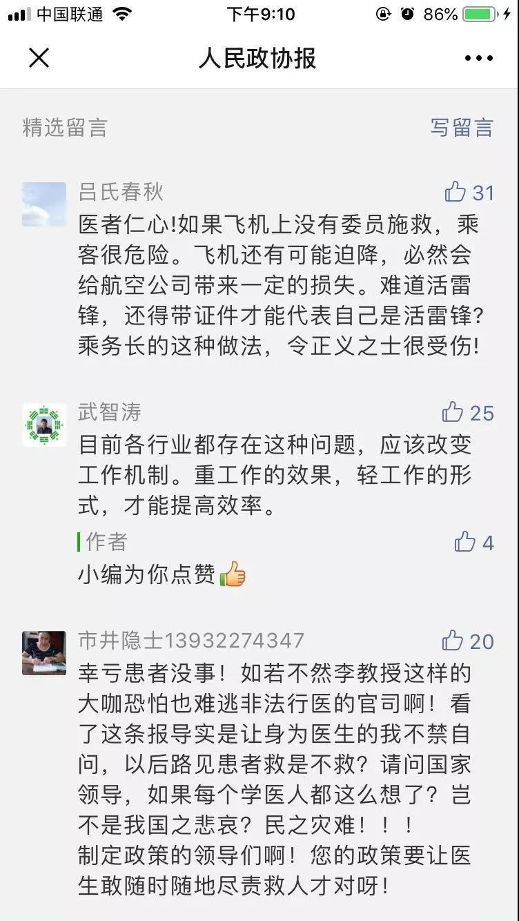 6月30日,人民政协报、人民政协网的新闻报道《政协委员空中救人,事后被告知出示医生证件》刊发后,引发了各界广泛关注,点击量近400万,网友跟帖超5000条,大家在为政协委员救人行为点赞的同时,也就事后该不该再出示医生证明,如何避免救人者“无证上岗”的尴尬发表了自己的看法。