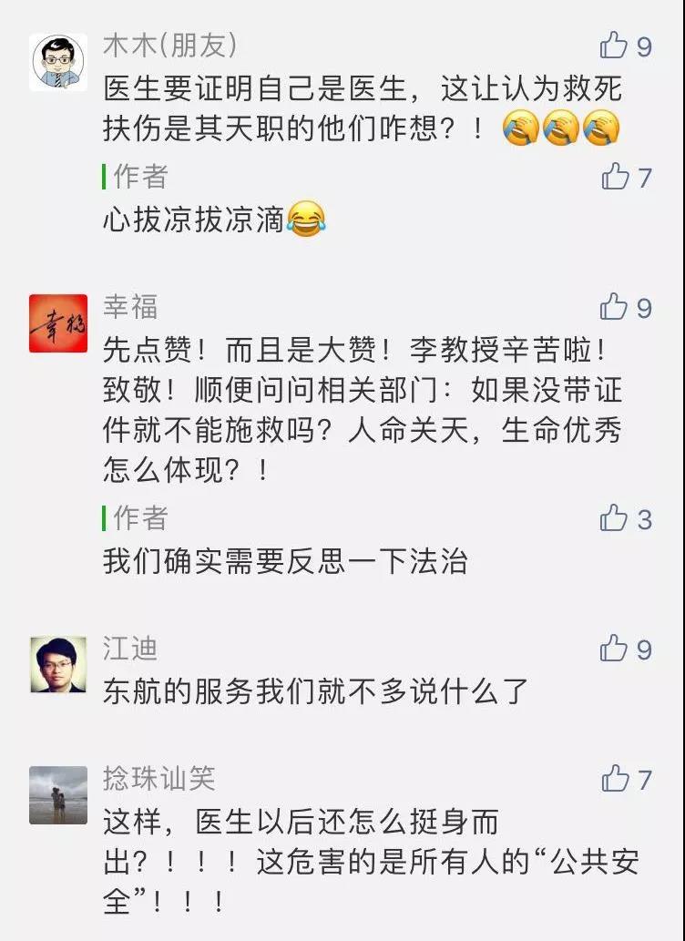 网友天马行空710831说:“以后请别广播找医生,火车飞机上自己配医生护士,这样的话就没有查证的烦恼了?!笨梢灿型巡⒉蝗贤鏕ladiator-Lolita所说:“我们并不是对自愿参与救助的人的热心提出反对,但承运人的监管责任必须到位。承运人不轻易将别人的性命假借他人,是认真负责!”