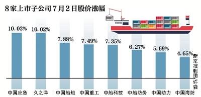 7月1日发布公告的8家上市公司资产总计超过3300亿元。其中,中国船舶、中船防务、中船科技等3家是“南船”旗下子公司,中国重工、中国海防、中国动力、久之洋、中国应急等5家则是“北船”旗下子公司。