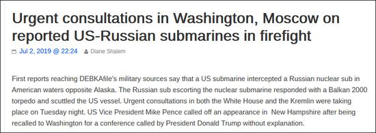 这篇题为《美俄潜艇发生交火,华盛顿和莫斯科紧急磋商》的报道,声称一艘美国潜艇在阿拉斯加对面的美国海域拦截了一艘俄罗斯核潜艇,后者的护卫潜艇随即发射一枚“巴尔干2000(Balkan 2000)”鱼雷,将美国潜艇击沉。