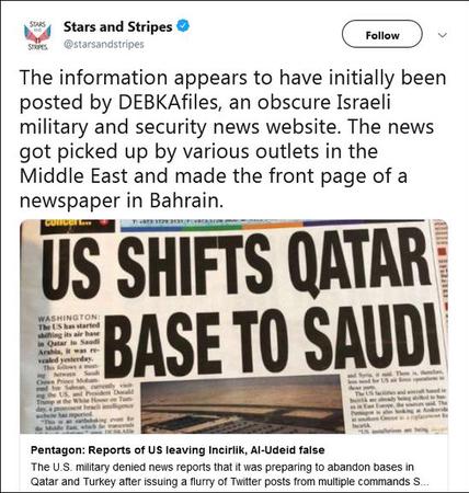 观察者网查询发现,“DEBKAfile”在制造“假新闻”方面还有着前科。2018年3月,“DEBKAfile”就曾爆料美国将放弃卡塔尔和土耳其的军事基地,这一消息还登上了巴林一家报纸的头版。