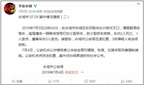 7月6日,北京青年报记者从永城市公安局了解到“0703”交通事故最新的调查情况。据永城市公安局调查,7月3日晚,谭某(女,23岁,无业)、刘某(男,24岁,学生)、张某(女,21岁,永城市属企业职工)3人,在永城市东城区雪枫路南段烧烤店吃饭、饮酒后,谭某驾驶豫NExx55玛莎拉蒂轿车,拉载刘某、张某2人离开。22时40分许,谭某3人驾乘车辆行驶至永城市东城区地税巷时,与正在该路段行驶及路边停放的皖FExx69大众轿车等8辆轿车发生轻微剐蹭,未造成人员伤亡。随后,谭某驾车逃逸。22时42分许,谭某驾车逃逸至永城市东城区东环路与永兴街交叉口,追尾撞击一辆等待信号灯的豫N0xx2L宝马轿车,致宝马轿车燃烧、车内2人(葛某,男,44岁;贾某,男,43岁)当场死亡、1人(驾驶员王某,男,31岁)受伤;肇事车内3人受伤。