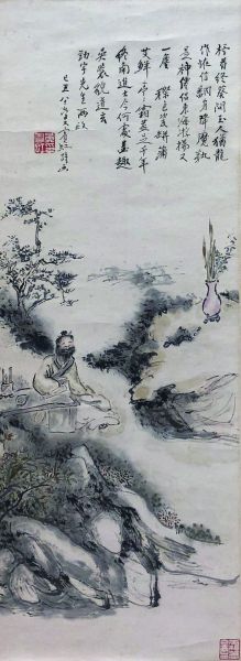 图中,黄宾虹所绘钟馗络腮胡子,着长袍便服,端坐于几案旁。钟馗面目并不十分清晰,但神态自若,右手倚靠在案上,左手垂放于膝盖。作者以简洁的线条勾画出人物轮廓,再以其一如既往的厚重笔墨,加以淡色与水墨渲染,粗率而不失神韵。几案上,陈设有笔筒、砚台及画卷,而在另一旁的山石上,则有一只带木质底座的花瓶,瓶中插着蒲草与艾叶等应景之物。在钟馗前侧,为山石与草木,淹润华滋;后侧为树木及若隐若现的远山。事实上,钟馗只占据不到五分之一的画面,整幅画既是一幅人物画,也是一幅山水画,是黄宾虹成熟时期的山水画风格。如果不是黄宾虹的题诗,画中人物也许只是一个虚构的文人高士,像黄宾虹其他山水画一样作为衬景而存在,观者未必能将其与钟馗联系起来。
