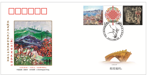 中国—古巴纪念封的的主图《红色圣地》,结合了中国艺术家吴晓林和古巴艺术家李·多明哥·冯对中古革命情谊的理解,让中国的革命圣地井冈山和古巴的革命圣地马埃斯特腊山跨越时空呈现在一张画纸上,两处革命圣地为主题。杜鹃花和蝴蝶花象征着两国的革命精神和深厚友谊,右下角的两个人物是两位艺术家本人在共同描绘两国的美好未来。