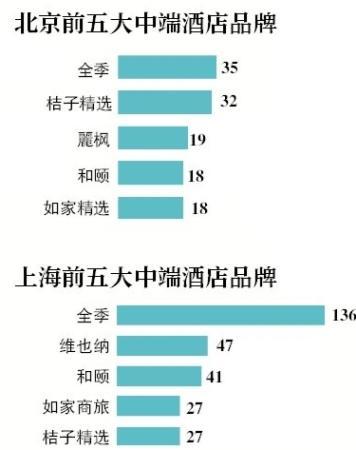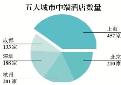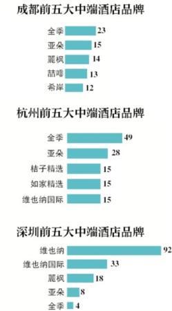 新京报记者选取北京、上海、杭州、深圳、成都五地,梳理多家酒店集团中端酒店品牌在当地的布局情况