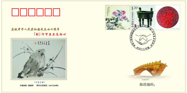 中国-哥伦比亚纪念封的的主图《王者之香》是由中国花鸟写意书画家霍春阳和哥伦比亚画家土木(Luis Cantillo)联手创作的水墨画,具有浓郁的中国特色,刚劲中透着文雅,粗犷中流出暗香。秃鹰是哥伦比亚的国家象征,是西半球最大的鸟,拥有很长的寿命。兰花是中国谦谦君子的代表,品行高洁,寓意知恩图报、友谊长存。土木以水墨绘就一块秃鹰形状的岩石,霍春阳则在岩石旁寥寥数笔点缀上兰花。两个意象的结合预示着中哥两国间的关系将日久弥坚、细水长流。两位艺术家从各自的文化中提取元素,融入到艺术创作之中,成就了这次富有意义的文化交流。