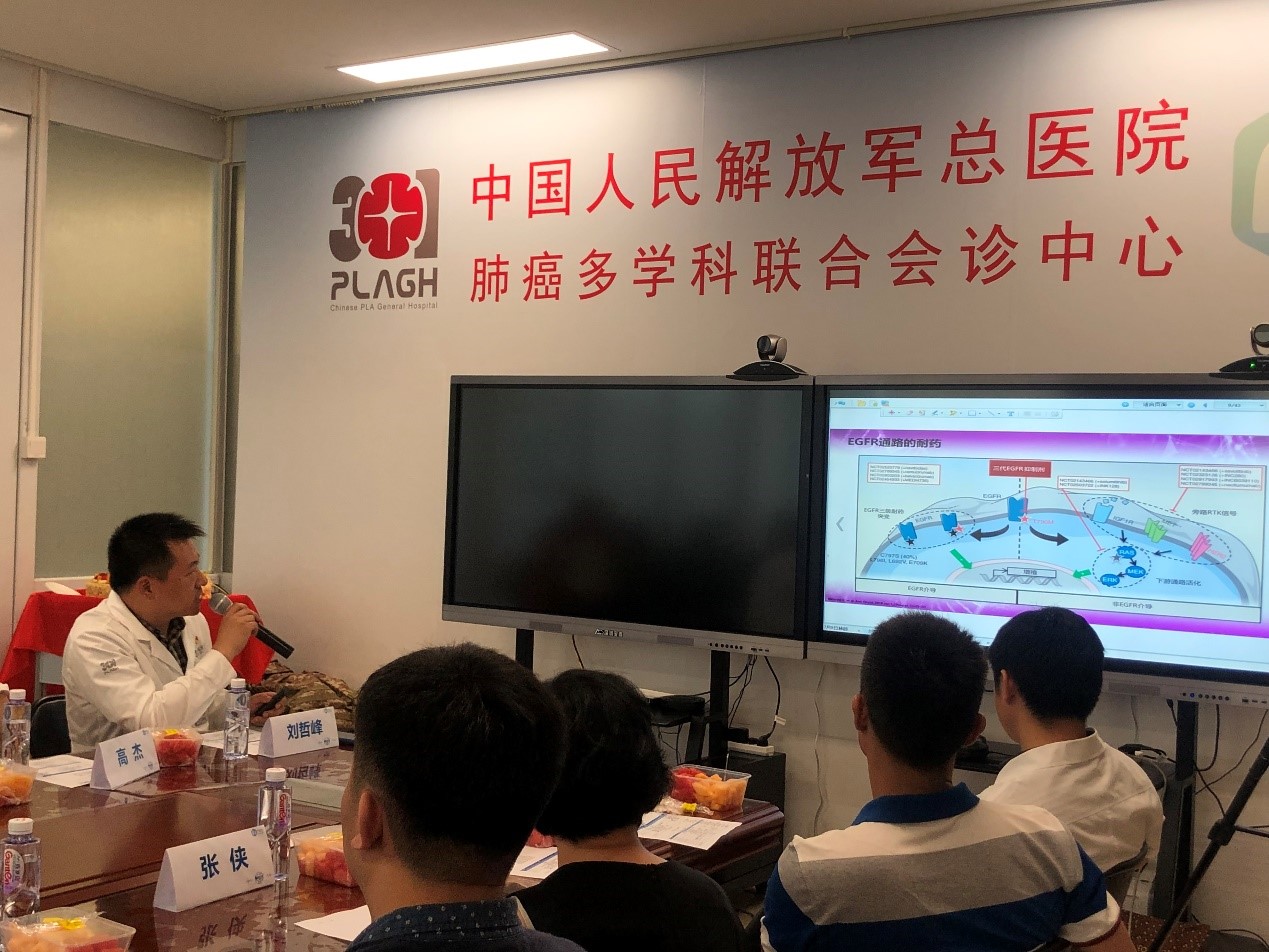 会上,刘哲峰教授分享了EGFR(表皮生长因子受体)晚期NSCLC(非小细胞肺癌)患者耐药后的应对策略,随后各位专家对北京胸科医院、解放军第五医学中心的两个病例进行了线上和线下讨论,就患者诊疗过程中的问题及下一步的诊疗方案提出了宝贵意见,充分体现了中心在患者诊疗中的优势。