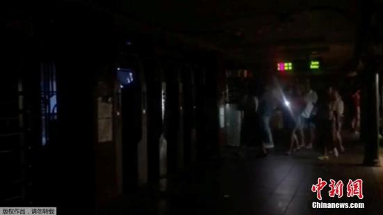图为纽约曼哈顿地铁里,民众摸黑出行。