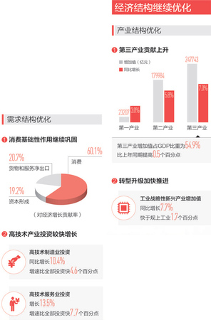 产业结构在改善。上半年,第三产业增加值占国内生产总值比重为54.9%,比上年同期提高0.5个百分点,比第二产业高15个百分点;第三产业增长对国内生产总值增长的贡献率为60.3%,高于第二产业23.2个百分点。产业内部结构也在调优。上半年高技术制造业增加值增长9%,比规模以上工业速度快3个百分点,高技术制造业增加值占全部规模以上工业增加值的比重比上年同期提高了0.8个百分点。
