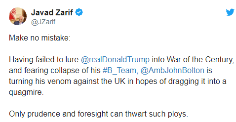 原标题:伊朗外长炮轰博尔顿:未能引诱特朗普发动战争,就希望把英国拖入泥潭